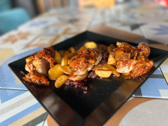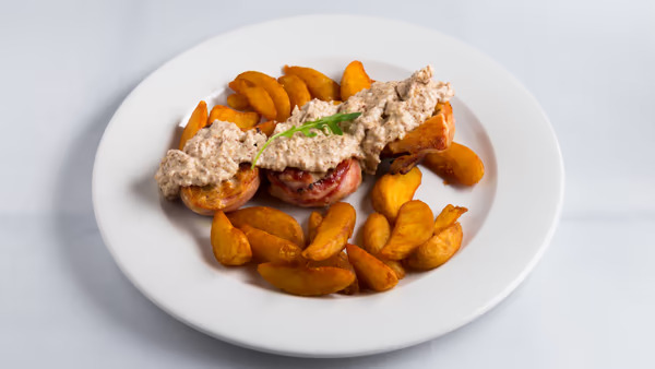 rolovano belo meso u slanini preliveno sosom od badema sa pueblo krompirom