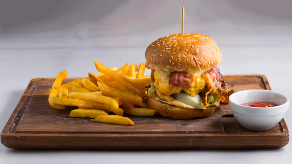 Pjuneće meso, slanina hrskava, čedar, domaći burger sos, zapečeni luk