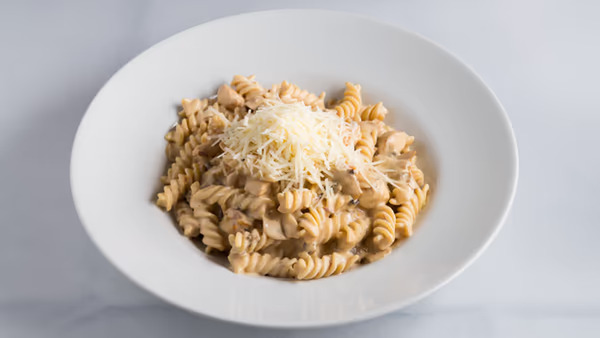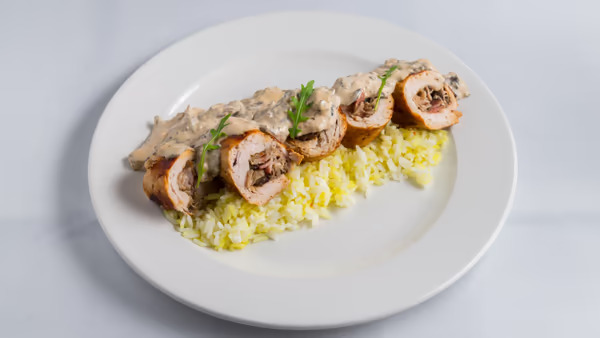 Rolovana ćuretina punjena mocarelom, slaninom i povrćem na riži, prelivena sosom od šampinjona