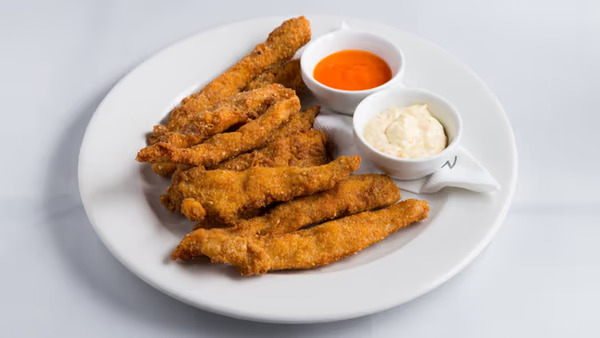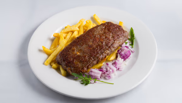 Mleveno meso punjeno začinjenom kobasicom i sirom sa pomfritom